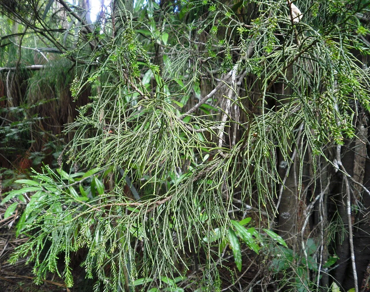 Manoao colensoi , commonly known as Silver Pine, Westland Pine, or Manoao in te reo Māori, is the sole species in the monotypic genus Manoao, making it truly unique among New Zealand's conifers. This evergreen conifer grows to heights of 15 meters tall with a trunk diameter up to 1 meter at breast height. Young trees display a distinctive cone shape, while mature specimens develop a tall, moderately spreading crown with yellow-green foliage and branches that weep gracefully at their ends. The juvenile plants exhibit limp needle-like leaves that gradually transform into overlapping yellowish-green scale-like leaves with a prominent ridge or keel on the lower outer surface. The bark is grey-brown and flakes off in thick scales, revealing reddish-brown patches underneath. One of the most remarkable features of this species is its extremely rare ability among conifers to spread via underground stems that produce suckers, ultimately giving rise to new trees; a trait shared only occasionally with another New Zealand genus, Phyllocladus.